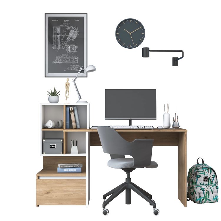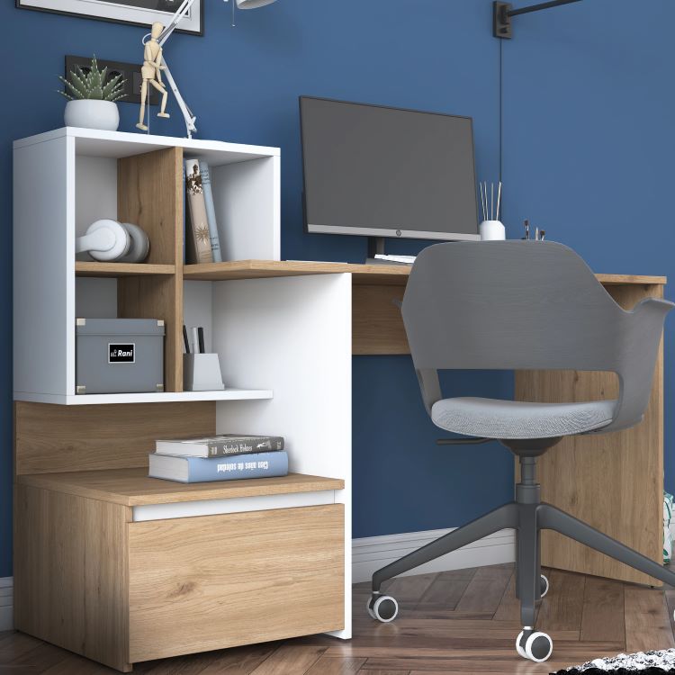 לשולחן יש ספריית מדפים לאיחסון קלסרים וספרים