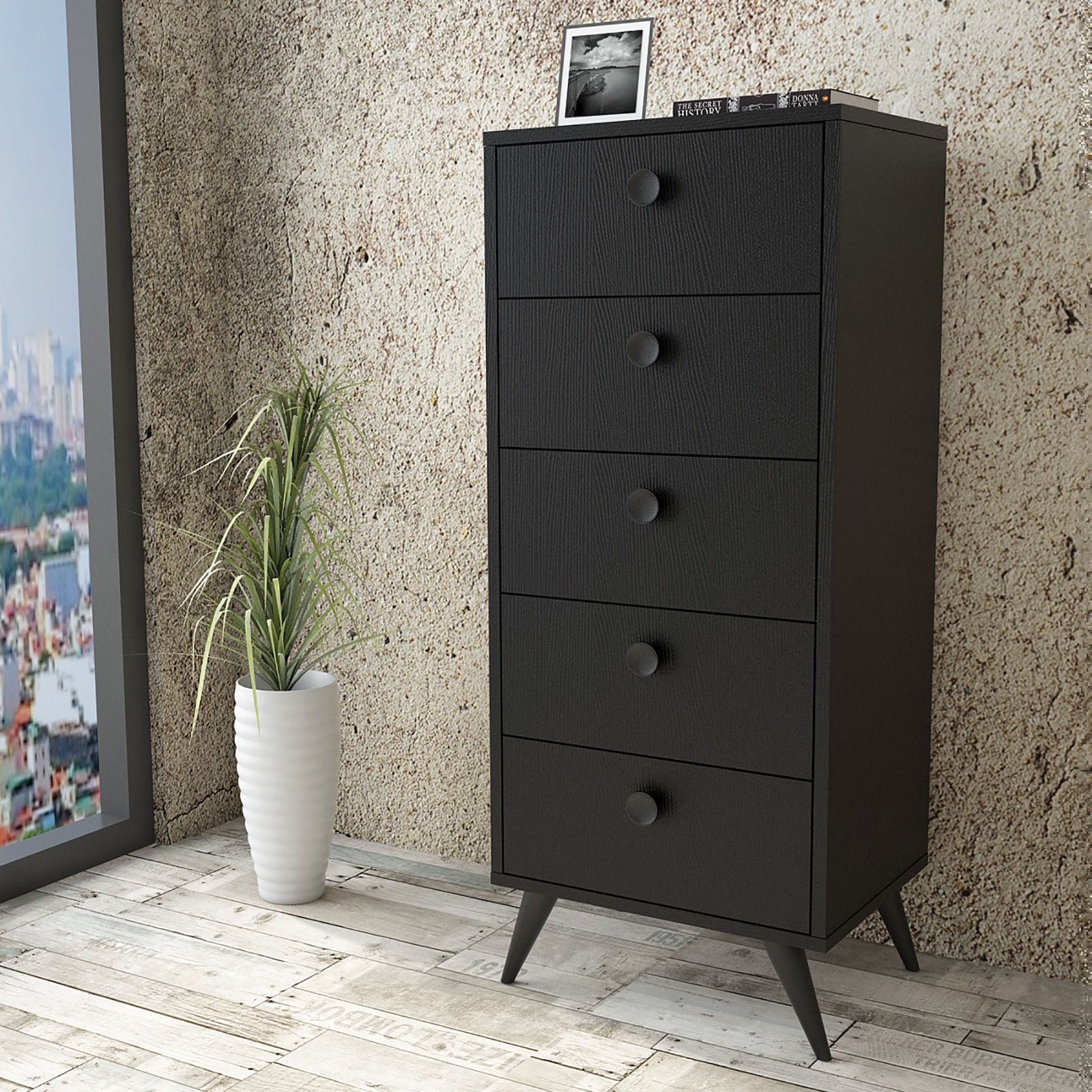 מציעה פתרון אחסון אידיאלי לחדר השינה או לסלון, עם 5 מגירות מרווחות לאחסון בגדים, מצעים, חפצי נוי ועוד.