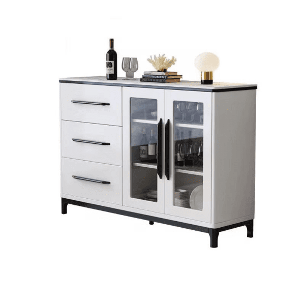 השידה כוללת שלוש מגירות מרווחות לצד זוג דלתות זכוכית עם מדפים פנימיים – שילוב אידיאלי בין נראות יוקרתית לשימושיות יום-יומית. העיצוב האלגנטי עם שילוב הצבעים לבן ושחור מוסיף נגיעה עכשווית ומתאים לסלון, פינת אוכל או חדר שינה.