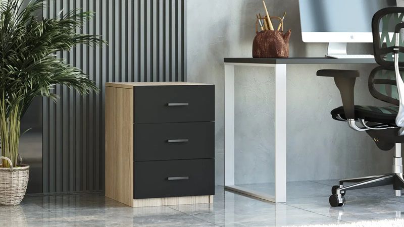 שידת קומודה מעוצבת למשרד בשני שילובי צבעים מרהיבים – אפור כהה בשילוב עץ כהה או שחור בשילוב עץ בהיר. השידה כוללת 3 מגירות מרווחות, מה שהופך אותה לפתרון אידיאלי לאחסון ניירת, ציוד משרדי וחפצים אישיים, תוך שמירה על מראה אלגנטי ומסודר.