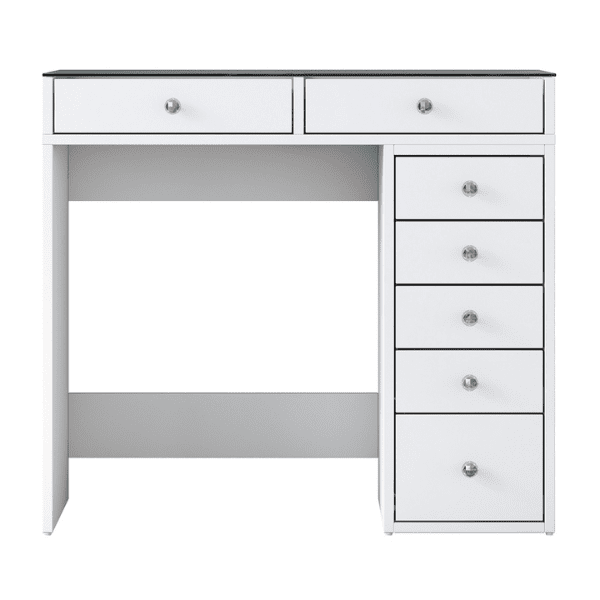 השידה כוללת מגירות מרווחות לאחסון איפור, תכשיטים ופריטים נוספים, עם מקום ייחודי לתכשיטים שיבטיח לך סדר וארגון מושלם. . העיצוב הנקי והמודרני משתלב בקלות בכל חדר, ונותן תחושה של יוקרה ואלגנטיות.