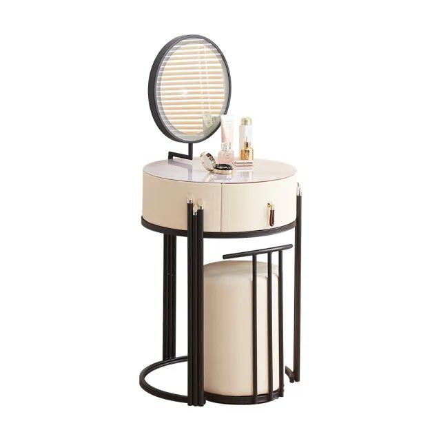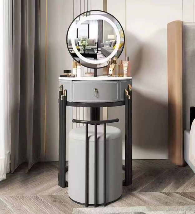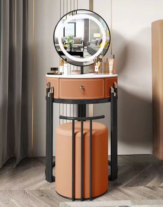 השידה כוללת מראה בקוטר 45 ס”מ עם תאורה היקפית רכה, מגירה בגובה 17.5 ס”מ לאחסון כל מוצרי האיפור, ותוספת של הדום בקוטר 39 ס”מ עם גובה ישיבה של 41 ס”מ – נוח וקל לשילוב מתחת לשידה כשלא בשימוש.