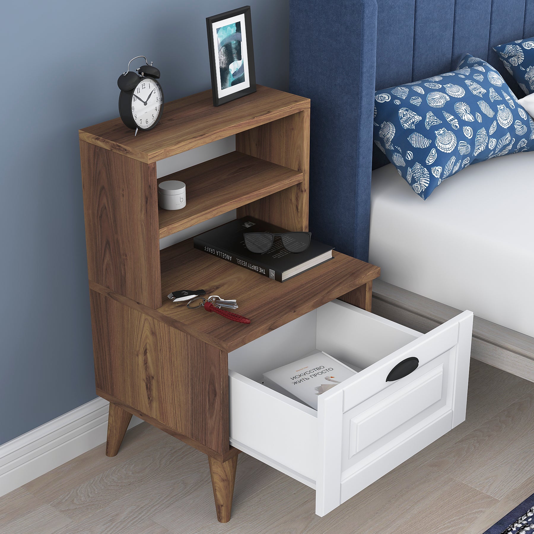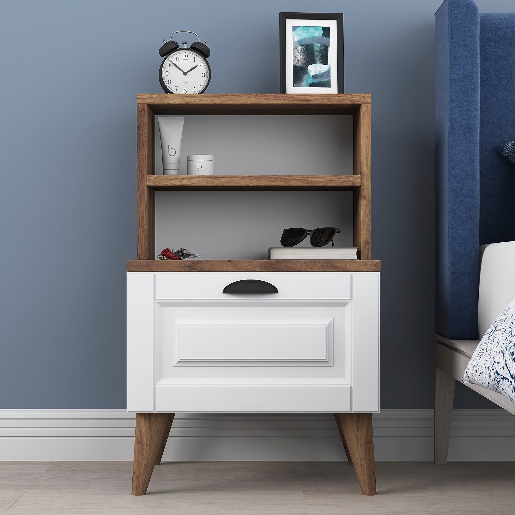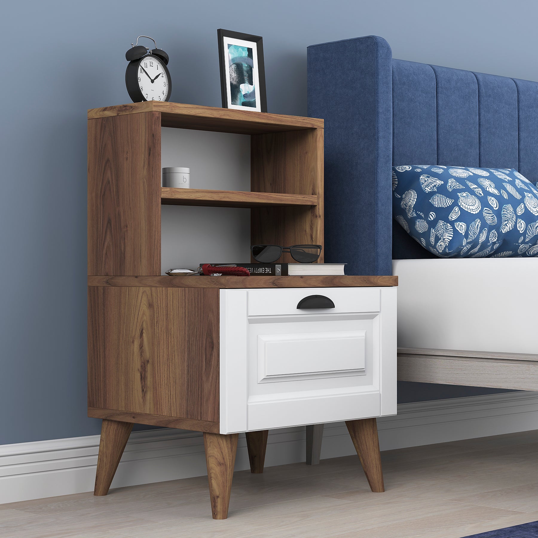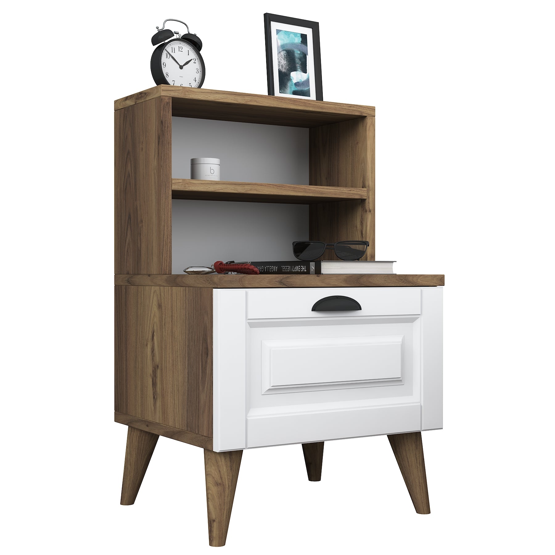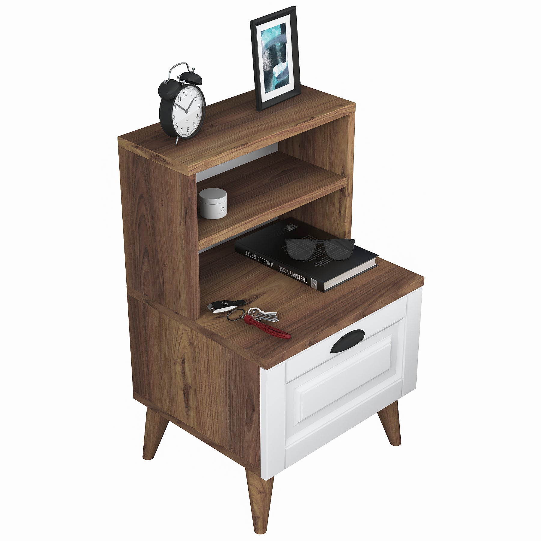 שידת לילה לצד המיטה בגוון חום משולב לבן