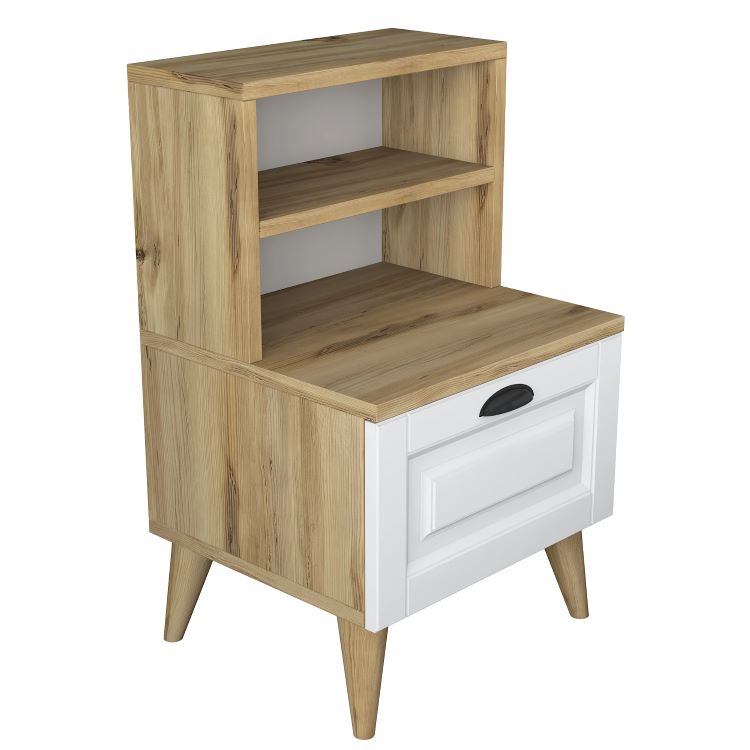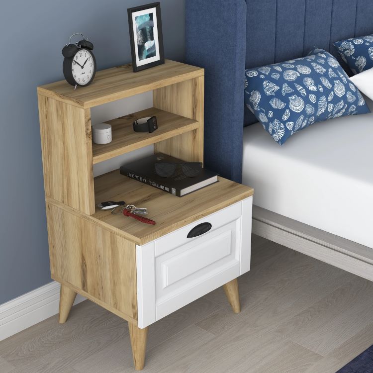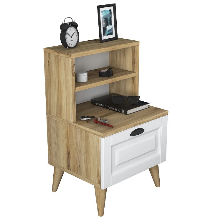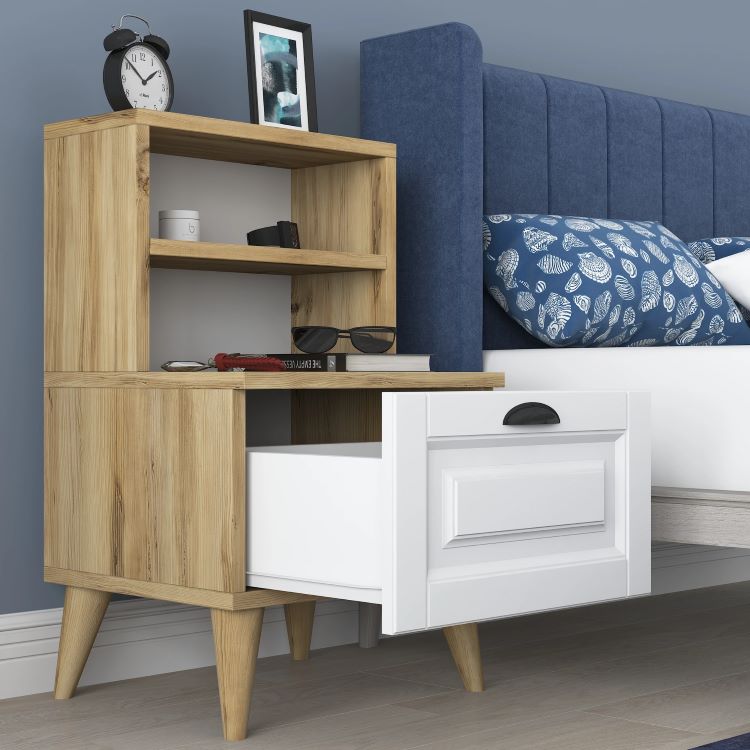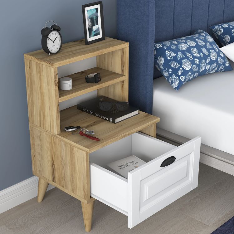 שידת לילה לצד המיטה בגוון אלון משולב לבן